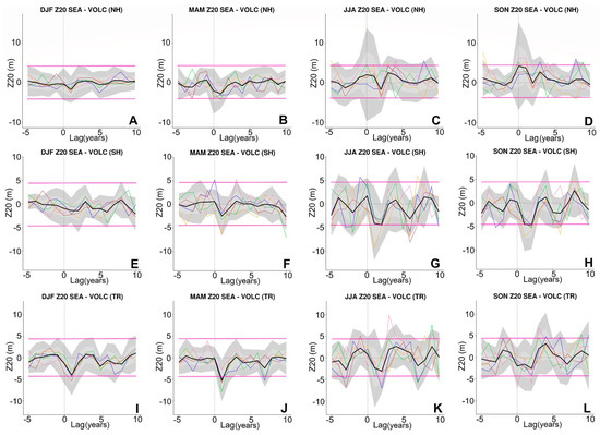 CTRL SEA for Z20 anomalies m), calculated after list of volcanic eruptions in Table 1, for five years before the eruption and ten years after the eruption. Horizontal: class of the eruptions (NH—(A–D); SH—(E–H); and TR—(I–L)); Vertical: seasonal SEA (December to February—DJF; March to May—MAM; June to August—JJA; and September to November—SON). Dark red line corresponds to the CTRL run, and light shaded red corresponds to one standard deviation of the CTRL run.