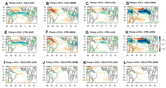 Seasonal correlation between precipitation and ATL3 SST index (at 95% significance level). Vertical: seasonal correlation (December to February—DJF; March to May—MAM; June to August—JJA; and September to November—SON). Horizontal: VOLC ensemble mean (A–D), CTRL simulation (E–H), and difference between VOLC and CTRL (I–L). Only statistically significant values are shown.