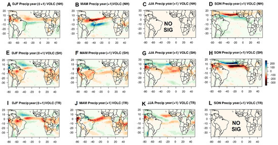 VOLC precipitation composites (mm/3 months) for one year after volcanic eruption as listed in Table 1. Lines correspond to the class of the eruptions (NH—(A–D); SH—(E–H); and TR—(I–L)), and columns refer to the seasonal SEA (DJF, MAM, JJA, and SON).