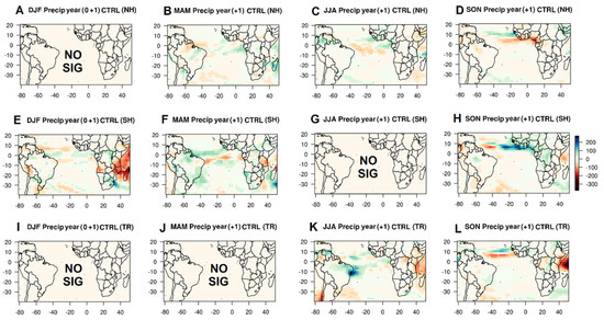 Composites of precipitation for volcanic eruptions selected as described in Table 1 were calculated for the first post-eruption year (+1) (Figure 10 for VOLC and Figure 11 for CTRL—only 95% significance t-tested values are shown). Year (+1) is shown solely because we wanted to examine impact of ATL3 SST changes due to volcanic eruptions in precipitation (occurred just in year (+1), as in Figure 2). Results exhibit no statistical significance for NH eruptions in JJA (+1) (Figure 10C) or TR eruptions in SON (+1) (Figure 10L). Dipole-shaped perturbations in precipitation are more prominent over the ocean and in north/northeastern Brazil for NH volcanic eruptions, mainly during MAM (+1) (Figure 10B) and DJF (0 to +1) (Figure 10A). For SH volcanic eruptions, the post-eruption year response is a drier South America and central southern Africa, primarily in DJF (0 to +1) (Figure 10E) and MAM (+1) (Figure 10F). In both JJA (+1) (Figure 10G) and SON (+1) (Figure 10H), the major response is over the Tropical Atlantic. TR volcanic eruptions have had an impact on DJF (0 to +1) (Figure 10I) and MAM (+1) (Figure 6J) precipitation, with drier Amazon region and central southern Africa and wetter eastern Brazil. VOLC simulation (Figure 10) displays a strong response for volcanic eruptions compared to CTRL simulation results (Figure 11).