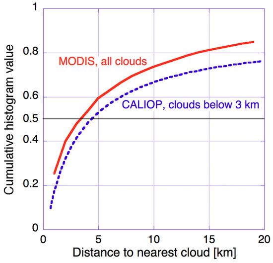 As mentioned in the introduction, we started examining cloud-related changes in aerosol properties building on the accomplishments of numerous earlier studies. One reason for the sustained interest in near-cloud aerosols is that aerosol populations are different in the presence of nearby clouds. Another reason is that the transition zone surrounding clouds (the zone of pronounced cloud-related changes in observed aerosol properties) covers a substantial portion of all cloud-free atmospheric columns. This is illustrated in Figure 1, which shows that for half of all clear columns over oceans, MODIS images indicate the nearest cloud within 3 km, while Cloud-Aerosol Lidar with Orthogonal Polarization (CALIOP) data indicates the nearest low-altitude (below 3 km) cloud within 4 km.