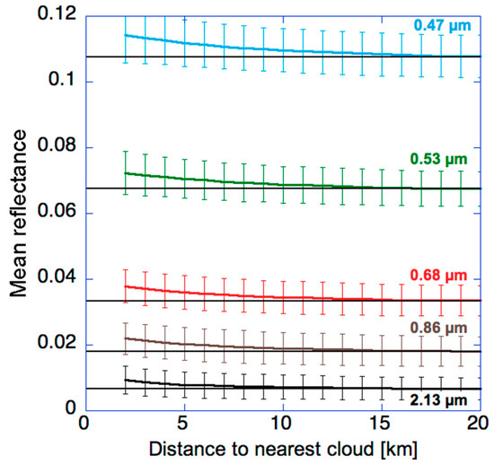 A notable feature of Figure 2 is that the near-cloud enhancements are stronger at shorter wavelengths. This is consistent with enhanced aerosol concentrations near clouds (as aerosol particles scatter more light at shorter wavelengths) but also with 3-D radiative effects: The stronger Rayleigh scattering at shorter wavelengths has a larger impact in redirecting the light coming from clouds toward a satellite above [33,35]. In contrast, undetected cloud particles scatter light fairly similarly at all wavelengths, which means that they cannot explain the wavelength dependence of enhancements in Figure 2. For example, the absolute increase would be roughly similar at 0.47 µm and 2.13 µm if undetected droplets were the main cause—and so the observed increase being much larger at 0.47 µm than at 2.13 µm points to other causes such as 3-D effects and enhanced aerosol scattering. (It is interesting to note that the relative increase is smaller at 0.47 µm than at 2.13 µm; this occurs because 0.47 µm reflectances are greatly enhanced by Rayleigh scattering and surface reflection, and this constant enhancement reduces the relative magnitude of near-cloud increases.) We point out, however, that undetected clouds (and instrument blurring) are still likely to contribute and to be especially important at 2.13 µm, where aerosol scattering is weak and Rayleigh scattering is negligible.