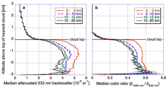 (a) Median 532-nm attenuated backscatter (β532) as a function of altitude above the top of the nearest cloud, plotted separately for different distance-ranges from the nearest cloud. (b) Same, but showing median color ratio values (related to particle size). Both panels display data from a global dataset of oceanic clear-sky columns where the nearest cloud is below 3 km. The figure is based on Figure 3 of [27].