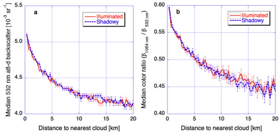 Median near-cloud vertically integrated 532-nm attenuated backscatter and color ratio in daytime CALIOP observations over all oceans between 30° and 60° latitudes in both hemispheres. The solid and dashed lines are for profiles that are on the sunlit and shadowy sides of the closest cloud, respectively. The figure is based on Figure 4 of [27].