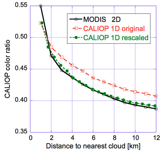 One should note that the collocated MODIS and CALIOP observations could be compared in Figure 7 because MODIS could reveal distance to clouds even for the CALIOP observations. When CALIOP data is used by itself, however, the distance to clouds is known only along the single line of the lidar track, and this can make one overestimate the distance to clouds if the nearest cloud is off to the side from the lidar track (and remains unnoticed by CALIOP). For statistically isotropic clouds however, this bias can be eliminated by rescaling the CALIOP-estimated distance-to-cloud values [48]. Figure 8 illustrates that after a such rescaling, the systematic near-cloud increase in CALIOP color ratio is nearly identical regardless of whether or not MODIS information on off-track clouds is used.