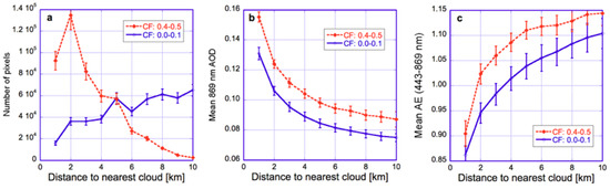 Impact of distance to cloud for two cloud fraction (CF) ranges. (a) Number of pixels; (b) aerosol optical depth; (c) Angstrom exponent. The data is plotted for the region and time period examined in Figure 2, Figure 3 and Figure 5. The error bars indicate the uncertainties due to interannual variability, estimated from the spread of results for individual years. Similar to the blue curves in Figure 2, all QA flags are used to screen the data except for the STRL and SSTW flags. The figure is based on Figure 6 of [50].