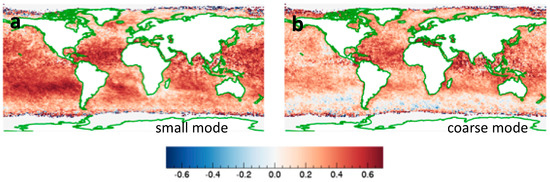 Seeking further insights into the CF-AE correlations, let us examine the CF-AOD correlations separately for the coarse-mode and small-mode AOD values provided in the MODIS Dark Target product [51]. We note that in the Dark Target retrievals over ocean the assumed size of aerosol particles is fixed [43], and so variations in AE correspond to variations in the relative amount of coarse-mode and small-mode aerosols. A comparison of Figure 12a,b reveals that almost everywhere, CF is significantly more correlated with AOD for small-mode than for coarse-mode aerosols. This may occur for several reasons, for example if small aerosols are more hygroscopic, if liquid-phase chemical processes in cloud droplets create aerosol particles, or if coarse mode aerosols occur above the boundary layer affected by cloud-related humidity variations. As discussed in [42], in much of the Earth AOD varying with CF more for small mode than for coarse mode aerosols implies that in those regions cloud contamination is not the dominant reason for the CF-AOD correlations observed in Figure 9a.