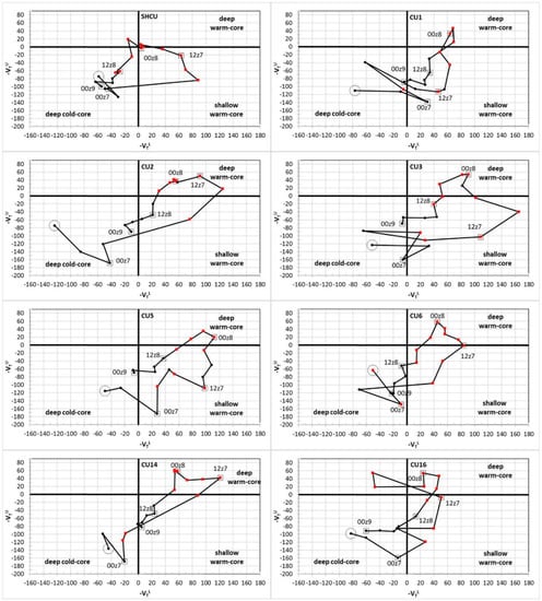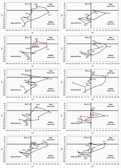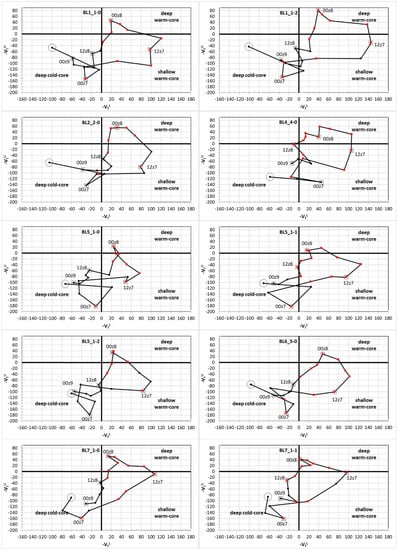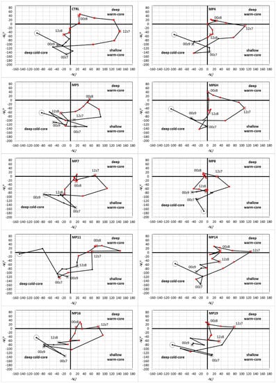 - Hart, R.E. A cyclone phase space derived from thermal wind and thermal asymmetry. Mon. Weather Rev. 2003, 131, 585–616. [Google Scholar] [CrossRef]