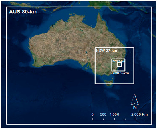In this study, the CTM domain configuration consists of 4 nested grids, as shown in Figure 2, comprising the outermost Australia domain (75 × 65 grid cells) at 80 km × 80 km resolution, NSW (60 × 60 grid cells) at 27 km × 27 km, the Greater Metropolitan Region or GMR (60 × 60 grid cells) at 9 km × 9 km resolution and the innermost domain covering the Sydney region (60 × 60 grid cells) at 3 km × 3 km resolution.