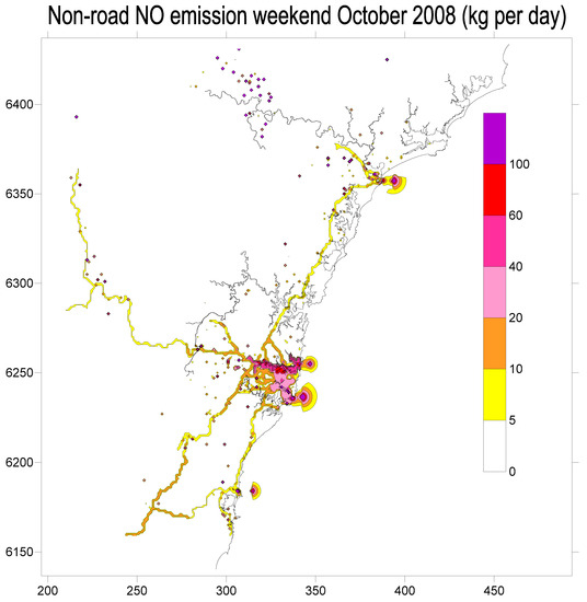 The 2008 NSW GMR Air Emissions Inventory data, which is the latest inventory available to this study, was segregated into 17 major source groups: power generation from coal, power generation from gas, residential wood heaters, on-road vehicle petrol exhaust, diesel exhaust, other (e.g. LPG) exhaust, petrol evaporation, non-exhaust (e.g., brake) particulate matter, shipping and commercial boats, industrial vehicles and equipment, aircraft (flight and ground operations), locomotives, commercial non-road equipment, other commercial-domestic areas and industrial area fugitive sources, biogenic sources, and non-biogenic natural sources. Figure 3, as an example, shows the anthropogenic area source NO weekend emission for October 2008 and locations of power stations in the GMR. The source-dependent fraction for major source groups used in emission modelling is referenced in Appendix A of [18] in this issue of Atmosphere.