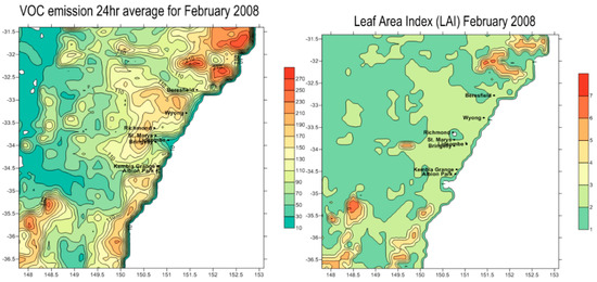 As shown in Figure 4, biogenic VOC emission occurs mostly in the west of Sydney and the Blue Mountain area, the National Park areas in the north, the lower Hunter region and inland of the Illawarra escarpment. In general, isoprene and monoterpene have similar spatial patterns as VOC distribution and reflect the Leaf Area Index (LAI) distribution in the modelling domain [12].