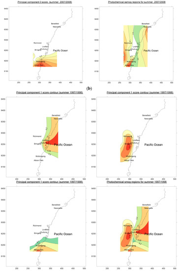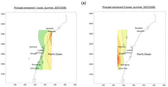 Using similar techniques as those of Yu and Chang [25], the principal component analysis (PCA) via correlation matrix on the 2007/2008 (1 November 2007 to 31 March 2008) summer ozone data was then used to delineate the regions in the Sydney area. The purpose of the PCA analysis is to transform the correlation coefficients between sites into component scores for each site based on the orthogonal principal components, in which the first component accounts for most of the variance and the second principal component the second most variance and so on. In this way, sites for which ozone are strongly related have similar component scores. Grouping the sites using a spatial contour plot of component scores identifies sites with similar ozone characteristics.