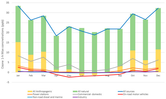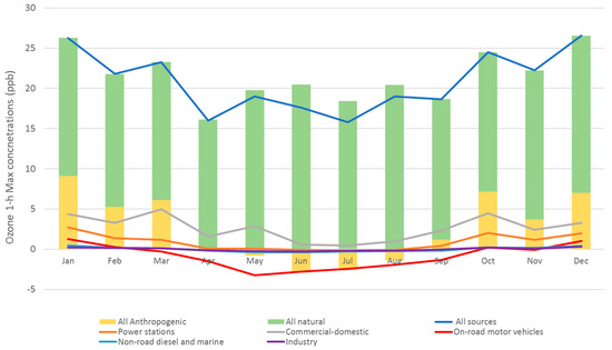 Contribution of all anthropogenic and natural emissions (bar graph) and different anthropogenic sources (line graph) to the monthly average of daily maximum 1-h ozone concentration in 2008 in the Illawarra region.