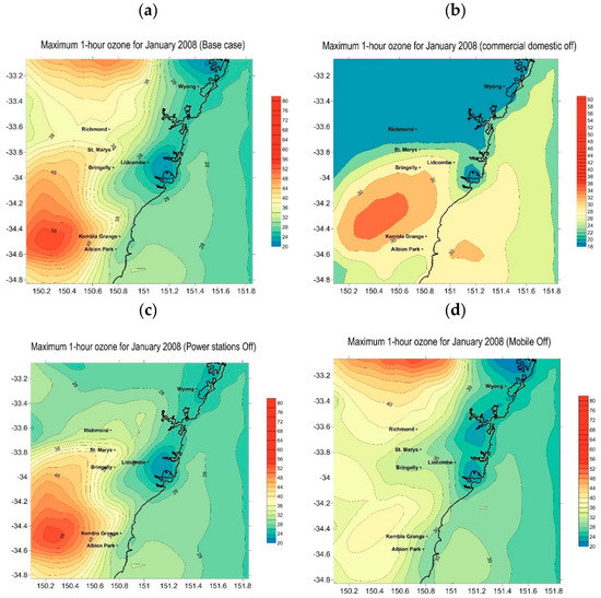 Monthly average of daily maximum 1-h ozone concentration for January 2008 in (a) base case, (b) commercial-domestic sources off, (c) power stations sources off and (d) on-road mobile sources off emission scenarios.