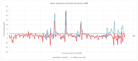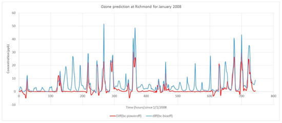 Time series of difference in predicted 1-h ozone (ppb) at Richmond for January 2008 between the base case and biogenic emissions off (blue) and between the base case and power stations emissions off (red).