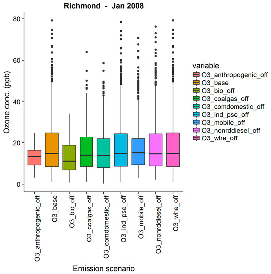 Box plot for 1-h ozone concentration (ppb) in January 2008 under different emission scenarios at Richmond.