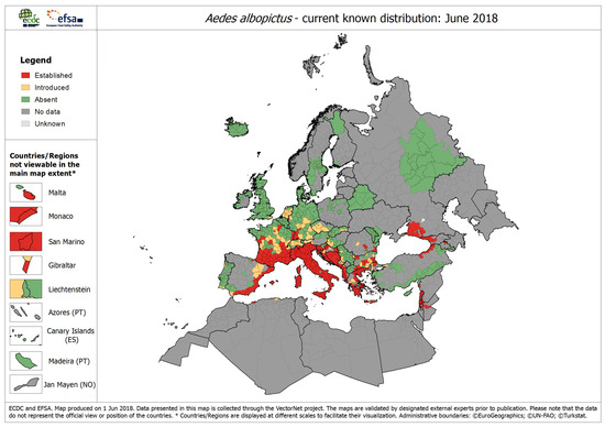 It was first introduced in Europe through international transport routes for used tires and ‘lucky bamboo’ [6]. The drought-resistant eggs can travel for long periods of time and survive until they reach a suitable environment for development. The first record of the Asian tiger mosquito in Europe was in Albania 1979 [7]. Since the later introduction and establishment in Italy [8], it has been reported in 31 European countries (Figure 1) including Albania, Austria, Belgium, Bosnia and Herzegovina, Bulgaria, Croatia, Czech Republic, France, Germany, Gibraltar, Greece, Georgia, Hungary, Italy, Malta, Monaco, Montenegro, the Netherlands, Northern Macedonia, Portugal, Romania, Russia, San Marino, Serbia, Slovakia, Slovenia, Spain, Switzerland, Turkey, United Kingdom, and the Vatican.