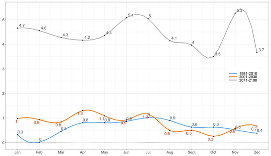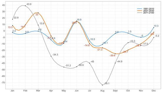 It is expected that the ending of the century will be highlighted with a significant drop in annual precipitation, particularly from spring to autumn (April–September) (Figure 2). Still, individual differences can be noticed between the coastal and the high mountain region.