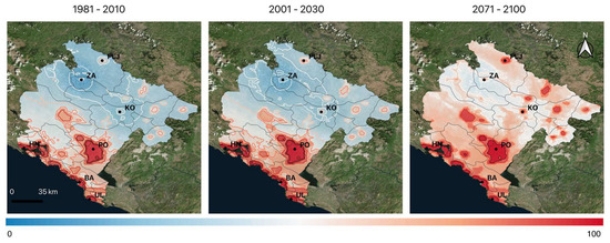 The current (1981–2010) and expected distribution of Ae. albopictus for the periods 2001–2030 and 2071–2100 are shown in Figure 5. The species is mainly abundant across the coast and in the valley of Ribnica and Morača, and the Zeta plain on the southeast. This spatial distribution is preserved through all three integration periods with a pronounced shift to higher altitudes by the end of the century resulting in a high suitability for the whole country. Opposing contributions from an expected increase in winter and decrease in summer temperatures for the northern regions result in little change in suitability for the first half of the XXI century. On the other hand, there is a significant increase in suitability as a result of the expected change in both the seasonal and mean annual temperature expected by the end of the century.