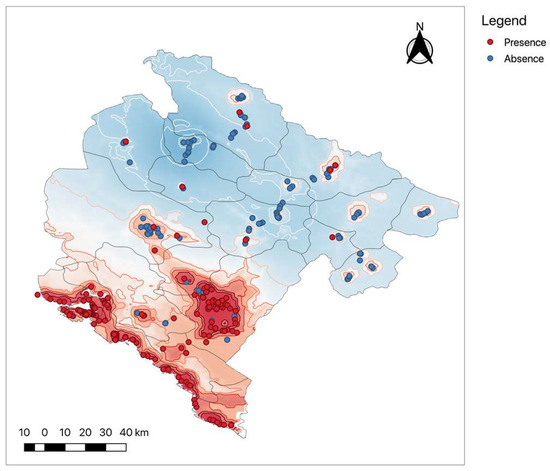 Studies that examine the projected climate parameters and their influence on the spread of Ae. albopictus point to a pronounced northward spread of the vector and reduced suitability in the current hotspots in southern Europe due to warmer and drier summers, as well as a vertical shift to higher altitudes [39,40,41,42]. There is already extensive work on mapping the global risk for Ae. albopictus together with studies focusing on Europe. However, these do not capture the observed data that was collected in Montenegro since 2014. Furthermore, these models fail to capture the regional heterogeneity caused by a very complex orography and a characteristic spatial heterogeneity of human population density and would not support surveillance and monitoring on the country level due to differences in resolution and scale.