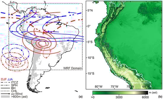 The atmospheric moisture transport in tropical South America is generally controlled by the seasonal cycle of the large-scale circulation features and the inter-hemispherical shift of the inter-tropical convergence zone (ITCZ). In the upper troposphere, during the austral summer months (December–February, DJF), the Bolivian high (BH) is well established and centered near 20° S and 60° W [5]. In the lower troposphere, a deep low pressure system develops in the Chaco region (around 25° S, Chaco low) [6], and the ITCZ is located in the Southern Hemisphere. Due to the height and length of the Andes, the terrain acts as a barrier, generating a climate divide between the western and eastern escarpment. While the eastern slopes are under the influence of the moisture-laden trade winds, the western slope experiences stable and, thus, drier conditions caused by the South Pacific high pressure system (SPH, Figure 1a). During the austral winter months (June–August, JJA), the ITCZ migrates northward, and the central Andes have their main dry season. The SPH induces large-scale subsidence [7], while in the upper atmosphere, a westerly flow blocks the transport of moisture from the Amazon. In contrast, the northern Andes experience rainy periods, due to the prevailing easterlies. Thus, the climate conditions exhibit both a strong zonal and meridional gradient. For more details on the South American monsoon system, see [5,8,9,10,11,12], among others.