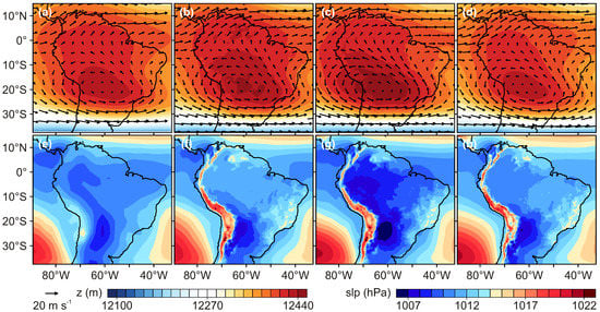 Finally, the spatial patterns of the aforementioned features are illustrated in Figure 3 and Figure 4 for selected cases only. Figure 4a–d shows the upper-level (200 hPa) large-scale circulation (uv-wind vectors, m ) and z (shaded, m) for DJF of ERA, WERAN, WERA, and ERA5. As expected from the Taylor diagram and the biases, the simulations resembled the controlling features with the anticyclonic vortex centered over 20° S and 60° W, consistent with ERA5 and the driving fields. The southerly extension of the high pressure system, as well as the meandering structure of the westerlies forced by the anticyclone were well captured. During the austral winter months (JJA), the displacement of the BH and the northward shift of the westerlies were reproduced by the experiments (not shown).
