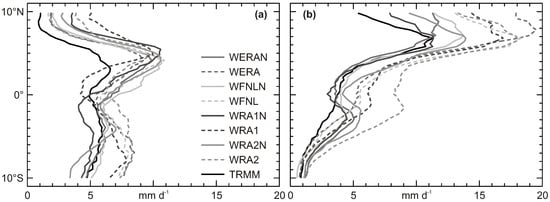 Mean precipitation profile (mm ) zonally averaged between 70° W and 30° W of WRF experiments regarding ILBC specification and TRMM: (a) DJF and (b) JJA.