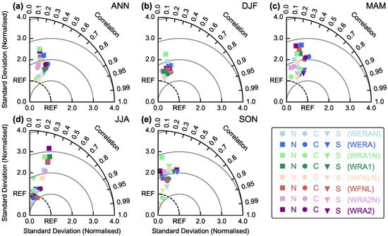 Taylor diagrams of WRF precipitation against TRMM (pentads, mm ) for each subregion (N, C, S), for (a) annual (ANN) and season (b) DJF; (c) MAM; (d) JJA; and (e) SON.