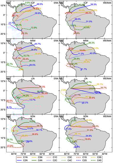 For the analysis of the atmospheric moisture pathways to the inter-Andean montane regions, Figure 8 and Figure 9 illustrate the representative air mass transport pathways obtained from the spherical clustering of the back-trajectories over all three years at the starting levels of 500 m agl and 6300 m asl, respectively. Here, only WERAN was analyzed as the simulation with the least uncertainty, as demonstrated in the previous section. To assess the added value of the downscaling procedure, the forcing data (ERA) are illustrated, as well. The dominant air mass trajectory clusters are displayed on a seasonal basis, since the large-scale atmospheric circulation is driven by a strong seasonal cycle. Overall, regardless of the height level, most of the trajectories pass over continental areas, which means that most of the moisture reaching the Andes highlands originates over the Amazon basin. However, westerly trajectories also evolve, although this is less frequent and obviously slower flowing, as indicated by the shorter pathways. Especially over coastal areas, the trajectories feature a bow-shaped pathway (except for JJA in Subregion N), which represents coastal wind systems associated with the Peru current in Subregion N, also described by Makowski Giannoni et al. [50], and the SPH in Subregion C and S).