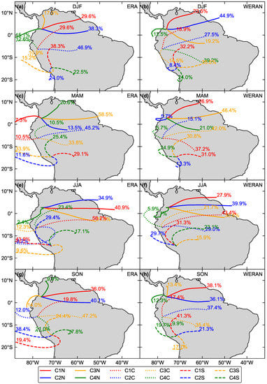 Especially during MAM and SON, Pacific air masses frequently occurred in Subregion S with a clear contribution to the moisture content over the Andes highlands. In this region, the Pacific trajectories revealed a large amount of moisture, although qv in comparison to the inner tropical regions had lower mixing ratios (4.4–6.13 g and 2.1–3.73 g ). During JJA, as the SPH strengthens and the ITCZ is located further north west, pathways were mostly blocked in the northern Andes, except for the 6300-m asl level (C2N, MAM) (Figure 9). Nonetheless, these trajectories had a low frequency of occurrences (6%) contrasting with C2S (JJA, 30%), which is under the influence of anticyclonic conditions, as indicated by the northwestern wind direction. Comparing the mean cluster trajectories of WERAN and ERA, it is evident that most of the pathways mainly differed in their length, which means higher wind speeds in the coarser resolved data. With respect to each individual year (Figures S1 and S2), the mean cluster trajectories showed similar atmospheric transport pathways, which pointed to the robustness of the results.