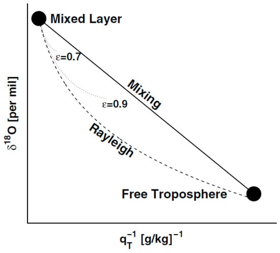 An isotopic mixing diagram of versus the inverse of the total water mixing ratio (qT−1) [].