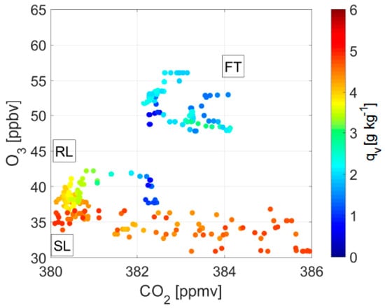 Figure 2 is the scatter diagram of O3 and CO2 in the morning (07: 27 UTC) of 6 September 2011, we can distinguish the air masses between BL and FT obviously from the humidity and concentration of O3 and CO2. The air mass in the RL and stable layer (SL) (all belonging to ABL) has low O3 values and variable values of CO2 and qV (humidity). However, the air mass in the FT is observed with larger values of O3, lower values of qV and less variability in CO2.