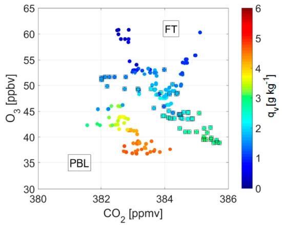 At noon (11:42UTC), the scatter diagram of O3 and CO2 changed (Figure 3). The characterization of two different air masses can still be distinguished from each other; the qV of BL air mass is higher while the qV is lower in FT. Nevertheless, the air mass in the FT appears different to that in the morning and shows a larger variability in CO2—this is considered an indicator of an ABL air mass that has entered the FT. Moreover, the O3 mixing ratios in the ABL are also increased slightly which could be related to downward transport of a FT air mass. The line made up of black boxes which were measured above the ABL in Figure 3 is the boundary of FT and BL. The qV of the boundary line is slighter higher than the background value of FT.