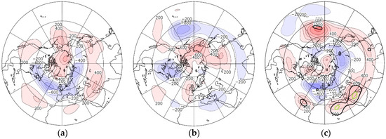 For strong-PJO events, the surface response during the 15-day post phase after CD reveals negative AO and enhanced negative NAO pattern, which is weaker during non-PJO events. Instead there is a dipole response pattern in geopotential field over the North Pacific. The difference of surface pressure anomalies (Figure S2c) and the one of 2-m temperature anomalies (Figure 10c) agree well with the response found by Reference [10] during week 2 of their so-called “WEAK” events for the observation (ERA-Interim) as well as for ECMWF forecasts model results.