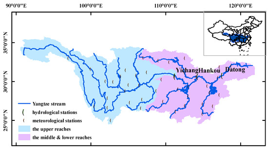 The Yangtze River (YR), being a major link among the world’s highest plateau (Qinghai–Tibet Plateau), largest continent (Eurasia) and largest ocean (the Pacific), is of utmost importance in terms of water resources transportation and circulation. However, in recent decades, more frequent flood hazards and waterlogging disasters struck the YR Basin, causing serious economic losses. Flood records showed that in the summer of 1954 and 1998, the entire Yangtze drainage area suffered from tremendous flooding [1,2,3]. Besides flood events, long-lasting wet and drought conditions in the YR Basin have also inflicted considerable impacts on the local ecological environment and human society over the region [4,5]. YR Basin is a hydroclimatically-sensitive region [6] so that the singularities of the large-scale atmospheric circulation could help predict extreme floods and droughts occurrence [7,8]. Therefore, identifying the connections between meteorological change (e.g., the Tibetan Snow Cover, East Asian summer monsoon (EASM), etc.) and frequent drought and flood events has been the main focus of hydrometeorological research in the YR Basin.