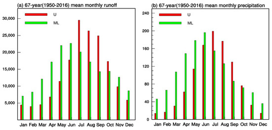 Distribution of observed multiyear average monthly (a) runoff (m3/s) and (b) precipitation (mm/day) from 1950 to 2016. The red and green bars represent the upper and mid-lower reaches of the YR, respectively.