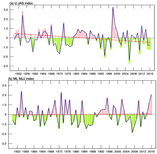 Given that floods and droughts are more likely to occur during the concentration period, we studied the upper and mid-lower runoff during their concentration period, which is more valuable for flood forecasting. Normalized runoff time series of the upper (JAS) and mid-lower (MJJ) reaches measured over 1950 to 2016 were examined using simple linear regression and Mann–Kendall (MK) trend test to identify the long-term trends (Figure 3). A significant downward trend at the 95% confidence level was found in the upstream flood-season streamflow variations, while no obvious trend was detected for summer runoff change in the mid-lower YR during 1950 to 2016 based on the MK test. The temporal variation of both upper and mid-lower Yangtze runoff exhibits significant variability on the interannual timescale.