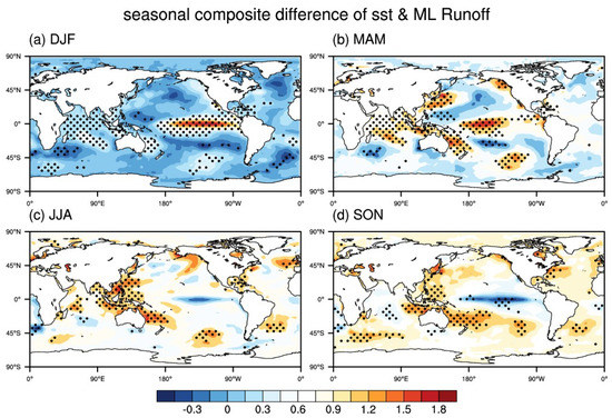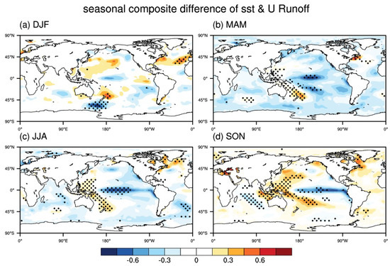 The composite difference of Sea surface temperature (SST) from the previous winter to autumn. (high—low upper July–August–September (JAS) runoff years; color shadings). Black dots are statistically significant at the 95% confidence level on the basis of a Student’s t-test. In this study, DJF means December-January-February, MAM means March-April-May, JJA means June-July-August and SON means September-October-November.