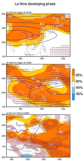 The JJA composite of the 100 hPa and 500 hPa geopotential height fields, sea level pressure (Z200, Z500, and SLP), and wind (UV200, UV500, and UV850) in the CP–La Niña developing phase from 1950 to 2016. The blue contours represent the climatological mean of JJA Z200, Z500, and SLP plus the corresponding anomalies, that is, the real condition. The shadings indicate the areas beyond 95% and 90% confidence level based on a Student’s t-test). Arrows denote the UV200, UV500, and UV850, and only those data points statistically significant over the 90% confidence level are drawn.