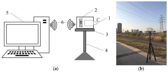 Image acquisition system and the field test. (a) Air visibility image acquisition system with 1. camera, 2. mainboard, 3. tray, 4. tripod, 5. computer, 6. Wi-Fi connection; (b) The picture of the field experiment site.