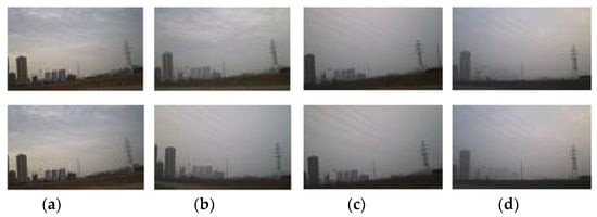 The latitude and longitude of the experimental site are longitude 118°70′44′′E and latitude 32°13′29′′N. An image acquisition system is established with a self-made image acquisition device, a router, and a computer, as shown in Figure 1a. The system is used to acquire images and establish an image set for visibility test. The visibility level corresponding to each image is determined, according to the local weather forecast. The image set contains a total of 300 images, which are classified into four levels according to their visibility level: good, mild pollution, moderate pollution, and heavy pollution, with 75 images per level. The field experiment is shown in Figure 1. Some of the acquired images are shown in Figure 2.