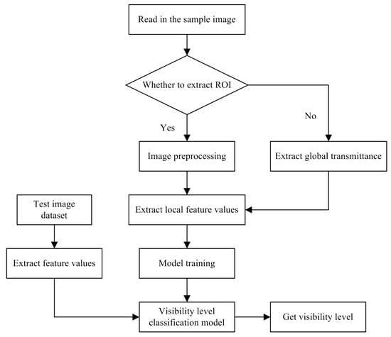 The visibility recognition method based on SVM can be divided into four steps: ROI extraction, image preprocessing, feature value extraction, and model training. The flowchart is shown in Figure 3.