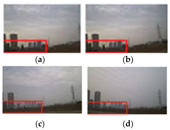 The results of the region of interest (ROI) selection by a plurality of rectangles with 50 × 15 pixels: (a) good air quality; (b) mild pollution; (c) moderate pollution; (d) heavy pollution.