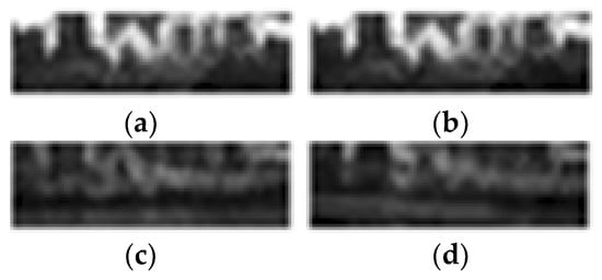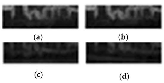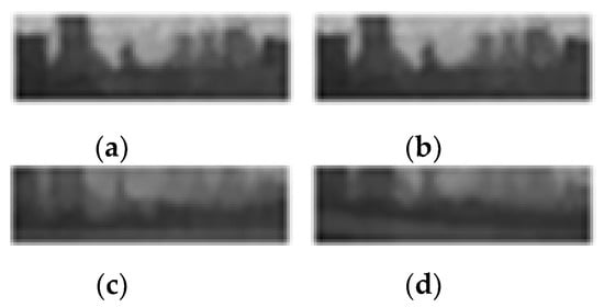 Next, the saliency map is automatically binarized by Otsu’s segmentation algorithm []. Then the binary image is divided into a plurality of rectangles with 50 pixels × 15 pixels. The rectangle with the largest number of salient points in the rectangle is selected as the final saliency region, i.e., ROI. The results of the selection are shown in Figure 4.