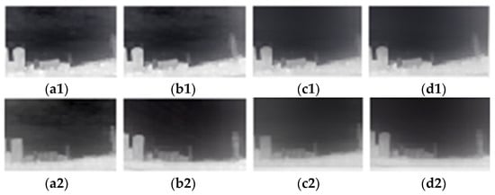 The results before and after the fast guided filtering are compared. (a1, b1, c1, d1) Before the fast guided filtering; (a2, b2, c2, d2) After the fast guided filtering. (a1, a2) Good air quality; (b1, b2) Mild pollution; (c1, c2) Moderate pollution; (d1, d2) Heavy pollution.