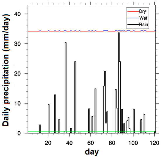 Distribution of rainy and dry episodes during the monsoon in 2001 in Sahel, using GPCP (Global Precipitation Climatology Project) daily rainfall data. The wet and dry events are marked by blue and red line respectively, and the threshold equal to 0.1 mm is marked by a green line. The day 0 and 120 correspond to the 15 August 2001 and 12 October 2001 respectively.