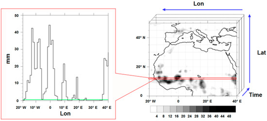 (Right) Lat × Lon + Time map of precipitation in mm/day between 0–50° N and 20° W–40° E over 4018 days (1998–2008) obtained from daily GPCP rainfall data. (Left) transect at 12° N showing rainfall as function of longitude during one day. The threshold equal to 0.1 mm is marked by a green line.