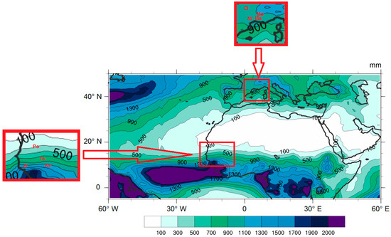 The annual cumulative rainfall over the period 1998–2008 is given in Figure 3. We observe a south–north precipitation gradient with high rainfall over the equatorial latitudes of up to 2000 mm per year over the Gulf of Guinea and decrease northward until the southern limit of the Sahara where the annual cumulative rainfall is 100 mm. A north–south gradient is also observed north of Sahara where cumulative rainfall increases with latitudes.