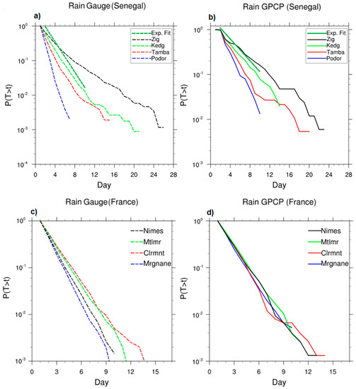 Considering rain gauges as reference (Figure 4a,c) we observe a number of rainy episodes varying in Sahel with latitude. The number of events is less in Podor (northernmost site, closer to the Sahara) compared to the three other of Sahel. The number of events is higher in Ziguinchor (the southernmost, more equatorial site) among the four in Sahel. An opposite conclusion is made for the sites in France, the highest number of events being observed in Clermont (site further north) and the lowest number of events in Marignane (the southernmost site of the four). We therefore note that the number of occurrences of long-lasting rain events follows a south–north rainfall gradient in Sahel and north–south in the mid-latitudes. At the nearest pixel of each station in Senegal and in France we have treated with the same methodology precipitation rate of GPCP satellites, (Figure 4b,d) over 11 years, 1998–2008. The estimation of T0 using the GPCP series gives results quite close to those of the rain gauges, but smaller spread of curves with respect to geographical distances. T0 GPCP data reveal the same exponential distribution than rain gauges for the considered sites. These results should be interpreted with caution because the observation series do not cover the same time period.