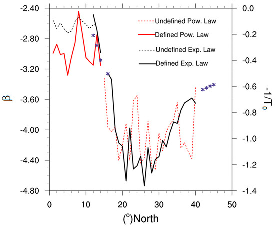 Assuming that rains follow a power law distribution defined by the Equation (3) over all latitudes from 0 to 40° N, we have calculated β, the exponent of fits (approximations in power law) for each latitude (Figure 5, red curve).